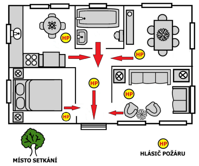 A pak si, nejlépe se všemi členy rodiny, vytvořte domácí únikový plán. Nakreslete si na papír půdorys nebo mapu vašeho domu či bytu. Když využijete čtverečkovaný papír, půjde Vám to lépe. Zakreslete všechny patra, místnosti, dveře a okna. Zahrňte všechny možné východy, včetně zadních dveří, oken a případně balkonů, pokud jsou v bezpečné výšce nad zemí. Vyznačte v nákresu bezpečnostní prvky. Potom šipkami vyznačte nejbezpečnější únikové cesty. Na co nesmíte zapomenout je i určení místa setkání pro členy rodiny v bezpečné vzdálenosti od domu. Toto místo by mělo být snadno identifikovatelné pro všechny její členy. Může se jednat o blízké bydliště babičky a dědy nebo např. oblíbenou restauraci nebo jen zastávku tramvaje či jiný, Vám blízký bod. Důležité je, abyste se všichni po opuštění bytu nebo domu na toto místo bezodkladně dostavili, aby bylo možné rychle zjistit, jestli někdo nezůstal uvnitř. Tato informace bude sloužit záchranářům pro případ provádění záchranných prací.