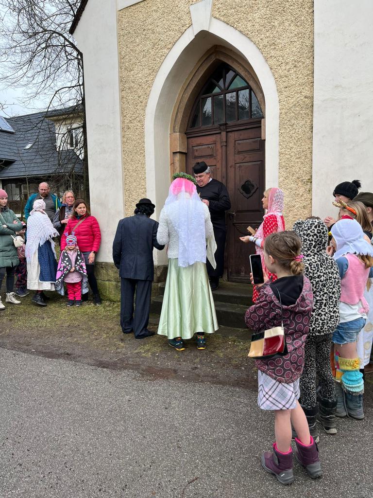 Ženich s nevěstou si řekli své ANO. Na závěr si děti zasoutěžily v sokolovně o ceny v nejrůznějších disciplínách. Všichni si pochutnávali na koblihách, skvělém chlebu se sádlem, jitrnici a dalších dobrotách.