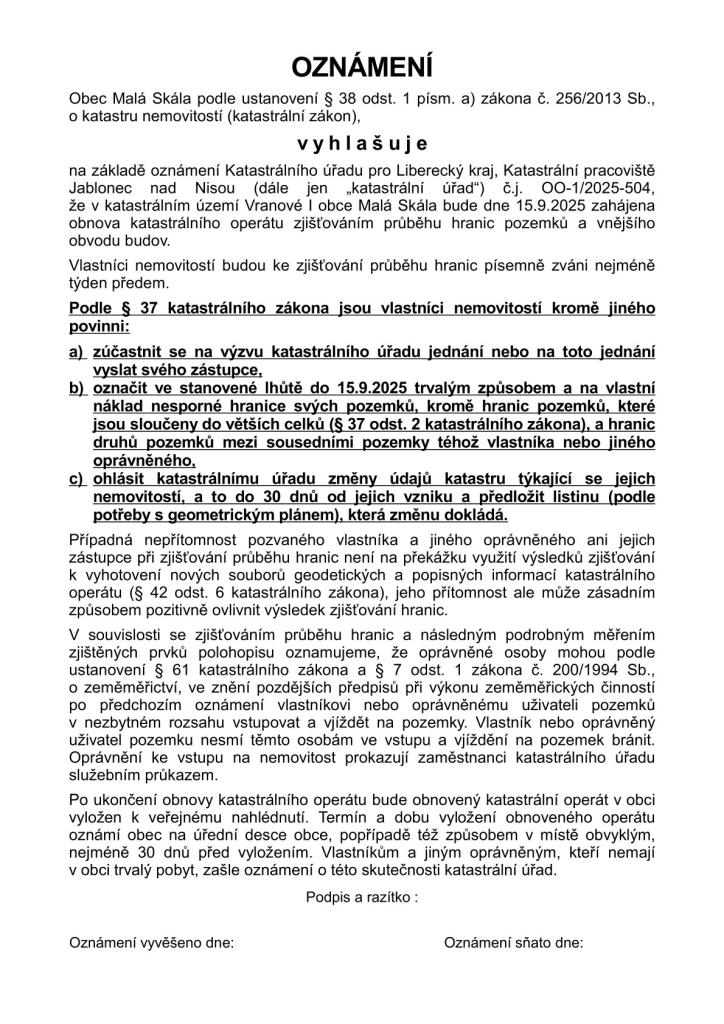 15.9.2025 bude zahájena obnova katastrálního operátu zjišťováním průběhu hranic pozemků a vnějšího obvodu budov.